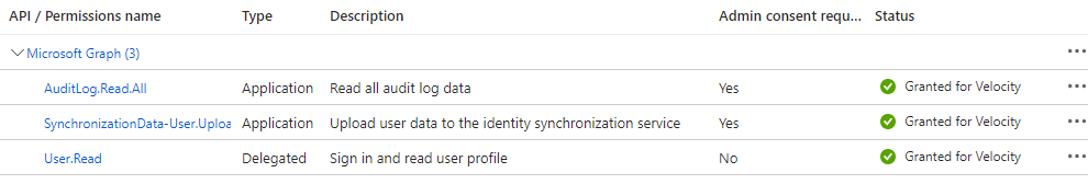 b. Permissions: Application, SynchronizationData-User.Uplpoad, Auditlog.Read.All.