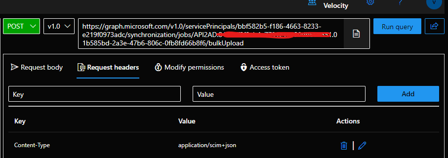 - Under the Request headers panel, add a new key value pair of Content-Type = application/scim+json.